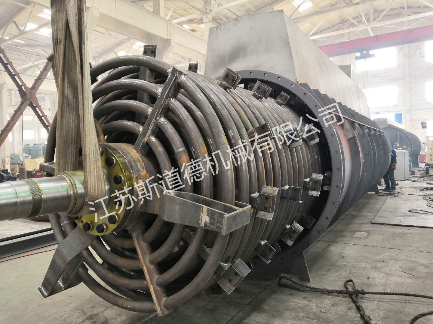 ?? PGD型盤(pán)管式干燥機(jī)不僅外殼可進(jìn)行加熱,同時(shí)內(nèi)部轉(zhuǎn)子也進(jìn)行加熱,大大增加了干燥面積,提高熱效率,確保物料徹底干燥。干燥機(jī)是由一個(gè)橫臥的外殼和一個(gè)帶有多套加熱管的轉(zhuǎn)子所組成,轉(zhuǎn)子上安裝多個(gè)加熱管,管上裝有可調(diào)節(jié)角度的推料器,在工作時(shí)既能加熱物料,又可將物料沿出料端方向推進(jìn)。轉(zhuǎn)軸內(nèi)部的蒸汽分布裝置能使蒸汽均勻地分布到每一件加熱盤(pán)管內(nèi),蒸汽在盤(pán)管內(nèi)流動(dòng),使加熱盤(pán)管保持恒定的溫度,冷凝水通過(guò)軸端特殊的裝置排出。